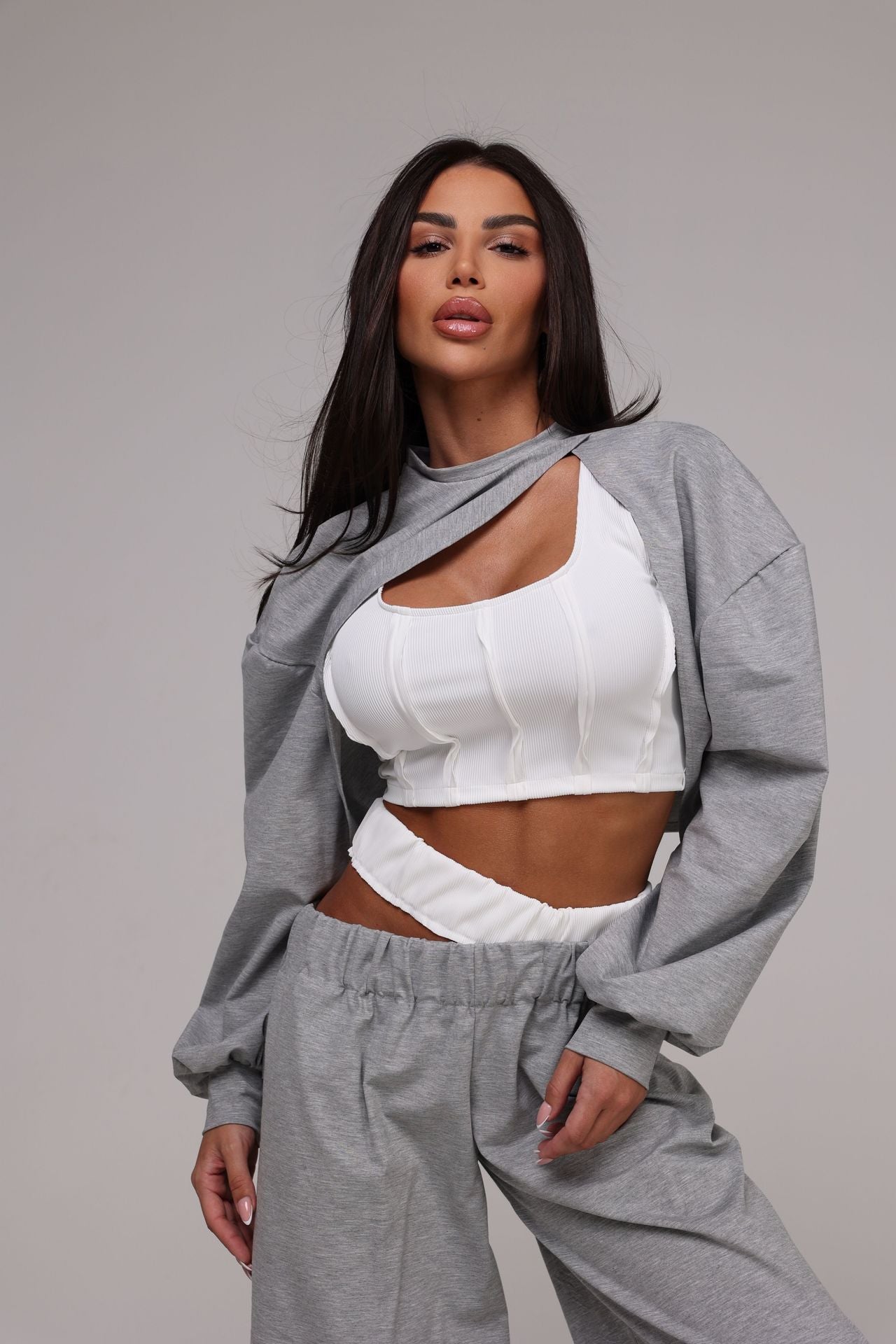 Къс спортен топ в бяло. Подчертава талията и придава женствена и смела визия.